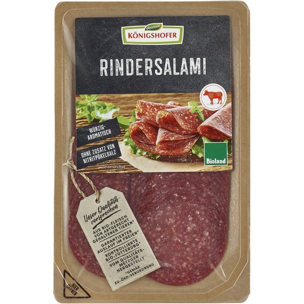 Unsere Rindersalami von Königshofer besticht durch ihr vollmundiges, harmonisch-würziges Aroma – ganz ohne Schweinefleisch. Sorgfältig aus hochwertigem Bio-Rindfleisch hergestellt und ohne Zusatz von Nitritpökelsalz gereift, ist sie ideal für eine herzhafte Brotzeit, zwischendurch als Snack oder auf jeder Käse- und Wurstplatte.