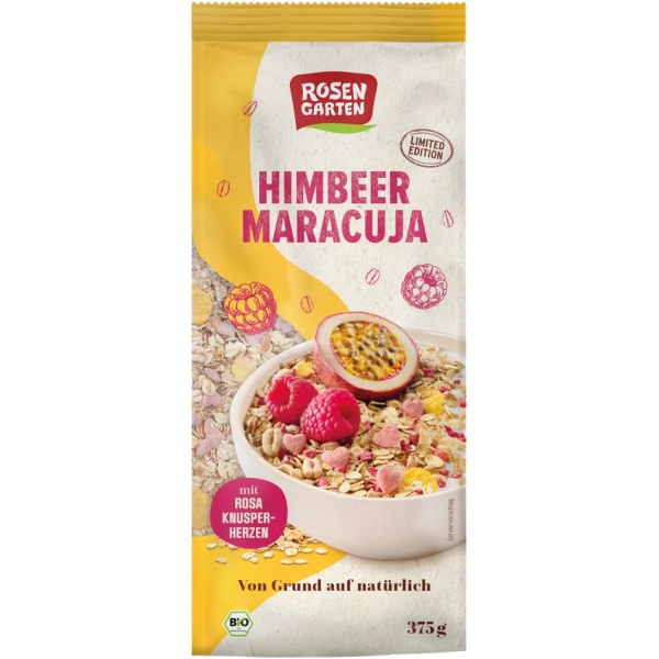 Unser Himbeer-Maracuja-Müsli von Rosengarten kombiniert fruchtige Bio-Himbeeren mit gefriergetrocknetem Maracujagranulat und knusprigen rosa Herzen. Knusprig, leicht säuerlich und unwiderstehlich lecker – ein Frühstück zum Verlieben, das frische Energie für den ganzen Tag schenkt.
