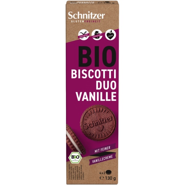 Biscotti Duo Vanille sind glutenfreie Bio-Kakao-Doppelkekse mit einer feinen Vanillecremefüllung. Knusprig im Biss, zartschmelzend im Kern und harmonisch süß im Geschmack. Perfekt für bewusste Genussmomente – ob zum Kaffee, Tee oder einfach als kleine Auszeit zwischendurch.