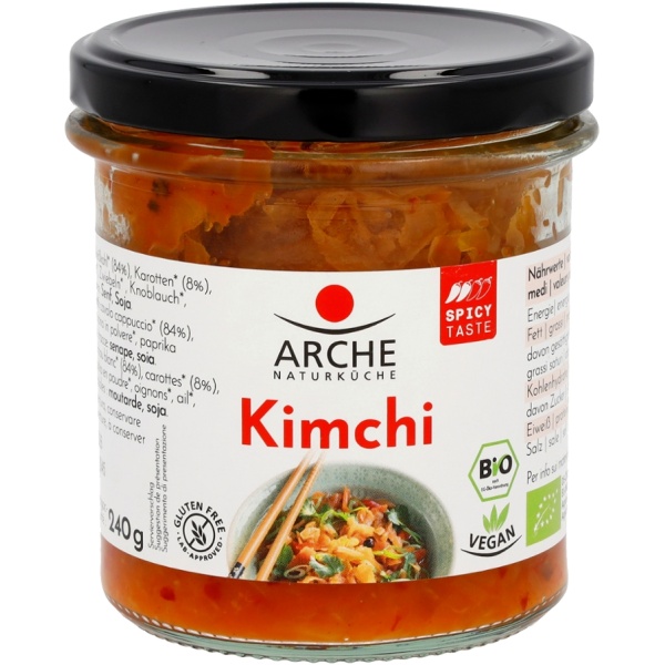 Das Kimchi von Arche bringt koreanische Fermentationskunst ins Glas. Bio-Weißkohl, Karotten und Zwiebeln werden mit Gewürzen zu einer würzig-scharfen, angenehm säuerlich-frischen Spezialität fermentiert. Schonend pasteurisiert bleibt es ungekühlt haltbar – perfekt als pikante Beilage sowie für Suppen, Wraps oder Bowls.