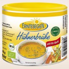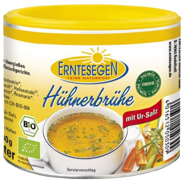 Die Hühnerbrühe von Erntesegen mit Bio-Hühnerfleisch und fein aufeinander abgestimmten Gewürzen ist besonders einfach zu dosieren und sehr vielseitig in ihrer Anwendung. Ideal geeignet ist sie zur Geschmacksverfeinerung von vielen Gerichten oder als kräftige Hühnerbrühe zum Trinken.