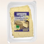 Unser Zitronen-Pfeffer-Käse ist eine besondere Bio-Käsespezialität, veredelt mit würzigem Pfeffer und einem frischen Hauch Zitrone. Jeder Bissen überrascht mit intensiven Aromen, während die fein pfeffrige Rinde ihn nicht nur geschmacklich, sondern auch optisch zu einem Highlight auf jedem Tisch macht!