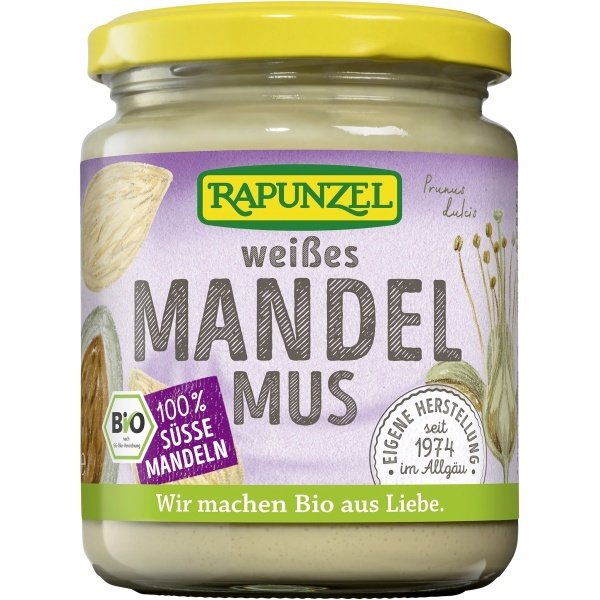 Weißes Mandelmus wird ausschließlich aus süßen Mandeln hergestellt. Die Mandeln werden sorgfältig und schonend mit Wasserdampf blanchiert und im Hause Rapunzel ohne Zusätze zu einem unvergleichlich aromatischen Bio-Nussmus verarbeitet.