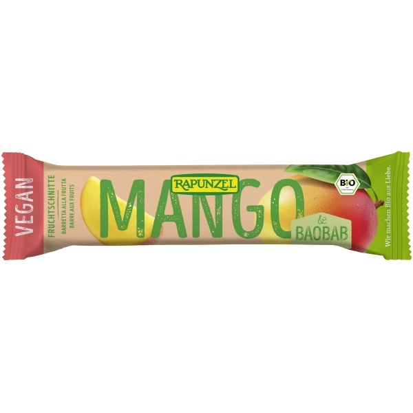 Mit dem tropisch, fruchtig-süßen Aroma der Mango wird diese aromatische Bio-Fruchtschnitte fein abgerundet durch das weiße Baobab-Fruchtfleisch. Dieses stammt vom afrikanischen Affenbrotbaum und schmeckt mit seiner leicht säuerlichen Note sehr angenehm.