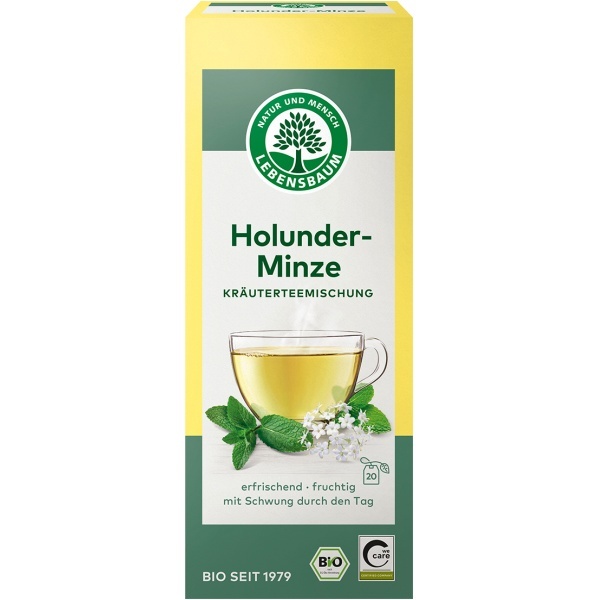 Auf der Basis von mildem Apfel treffen herb-süße Holunderbeeren und duftende Holunderblüten auf die vertraute Frische der Pfefferminze. Ob als fruchtige Erfrischung an heißen Sommertagen oder als wärmende Tasse an winterkalten Händen - unsere biologische Holunder-Minze bietet stets ein herrliches Kräuter-Bouquet erfischend-süßer Geschmacksnoten.