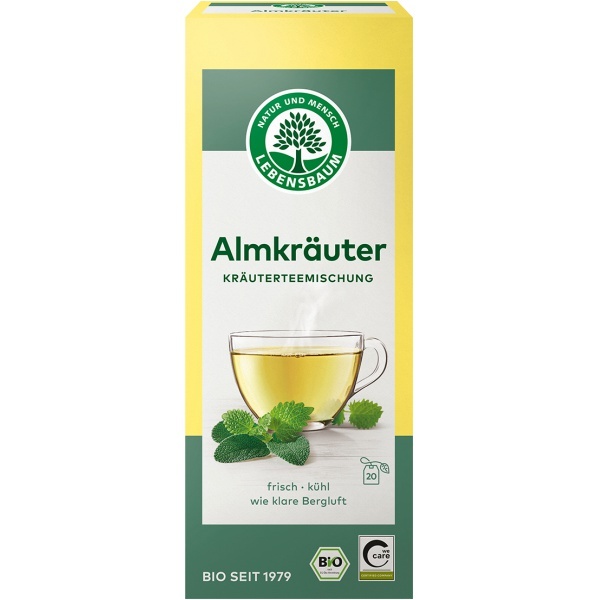 Schon bei der ersten Tasse werden Erinnerungen wach: Der Glockenklang der Kuhherden, das Grün der Bergwiesen und die süße, blumig-frische Luft 'droben auf der Alm'. Lebensbaum ist es gelungen, diesen Duft würziger Bio-Bergkräuter einzufangen und ihn liebevoll in kleinen Portionsbeuteln zu verpacken.