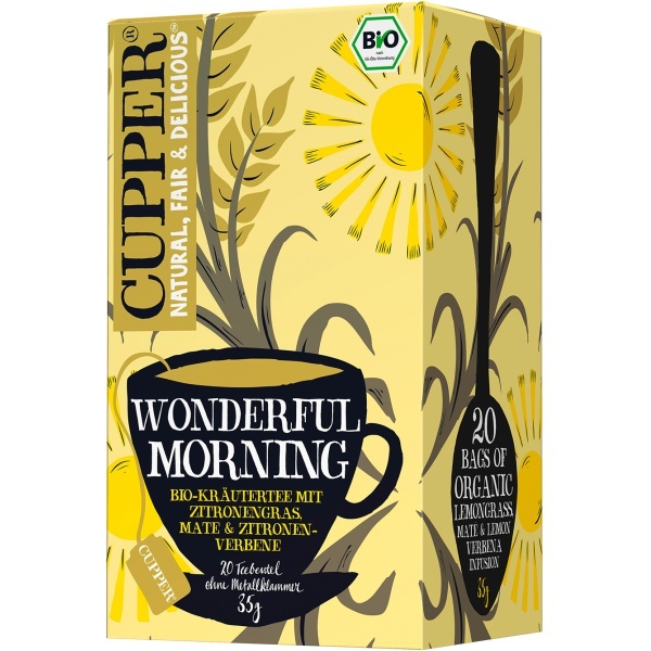 Die perfekte Teemischung um in den Tag zu starten: Sunshine in a cup! Alle Tees der Cupper-Serie wie dieser Kräutertee mit Maté und erfrischender Zitronennote stammen aus kontrolliert ökologischem Anbau und werden unter fairen Arbeitsbedingungen hergestellt.