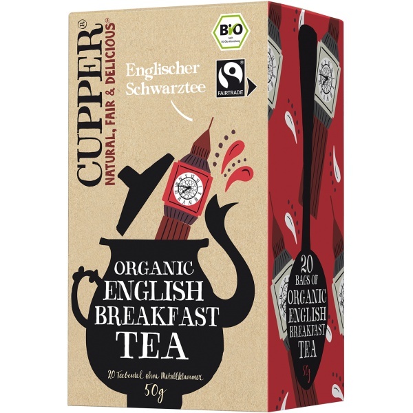 Cupper English Breakfast Tea ist eine spezielle Mischung aus feinstem Bio-Assam und Ceylon-Tee mit einem vollen und kräftigen Geschmack. Dieser vollmundige Tee schmeckt nicht nur zum Frühstück herrlich ausgewogen.