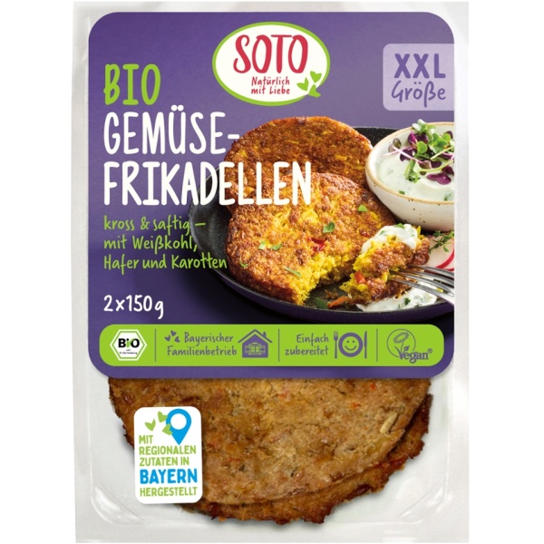 Unsere SOTO Gemüsefrikadellen im XXL-Format sind außen knusprig und innen wunderbar saftig. Frischer Weißkohl, rote Paprika, Karotten und nussige Haferflocken aus überwiegend bayerischem Bio-Anbau machen jeden Biss zum Genuss. Perfekt zu Salat, Kartoffelpüree oder als Snack mit Dip – einfach köstlich!