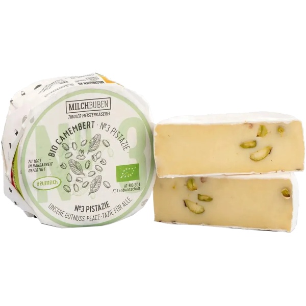 Genießen Sie echtes Tiroler Handwerk der Brüder Markus und Thomas: Unser Milchbuben Bio-Pistazien Camembert überzeugt durch feine Pilznoten und knackige, ganze Pistazien. Hergestellt aus hochwertiger Bio-Heumilch, ist dieser Weichkäse pur, paniert oder überbacken ein nussig-cremiges Highlight für Feinschmecker.