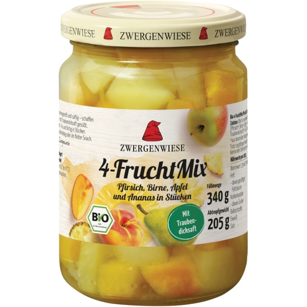 Sonnengereifte Frucht-Power im Glas! Der 4-Frucht-Mix von Zwergenwiese vereint sorgfältig ausgewählte, saftige Bio-Früchte zu einem harmonischen Quartett. Nur mit Bio-Traubendicksaft gesüßt und bereits verzehrfertig geschnitten – ideal als Kuchenbelag, zu Eis oder als fruchtiger Snack für zwischendurch.