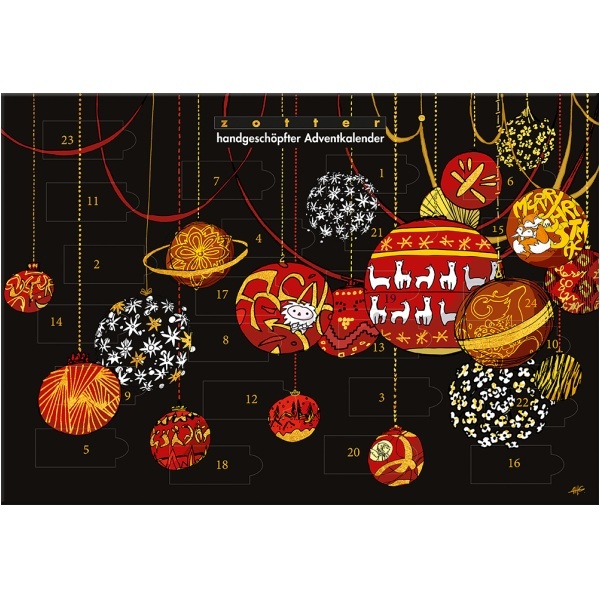 Ein chicer Wandkalender, gefüllt mit 24 verschiedenen handgeschöpften Mini-Schokoladen: Verführerische Sorten wie Nougatvariation, Butterkaramell, Marc de Champagne, Orangenlikör und Lebkuchen aus dem Hause Zotter sorgen für himmlischen Genuss. Diese wundervolle Schoko-Vielfalt in Bio- und Fairtrade-Qualität und das hübsche Design versüßen Ihnen die Adventszeit und sind auch ein wunderschönes Geschenk für Ihre Liebsten.