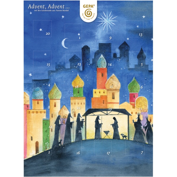 Unser Bio-Adventskalender versüßt Ihnen mit 24 köstlichen Türchen die Wartezeit bis zum Heiligen Abend. Die kleinen Schokofiguren werden aus fairer Naturland-Bio-Milch und fair gehandeltem Kakao aus kleinbäuerlichen Kooperativen hergestellt. Das extra lange Conchieren im Hause gepa lässt die Schokolade besonders zartschmelzend werden.