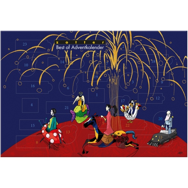 Der große Adventskalender von Zotter feiert die Vielfalt mit handgeschöpften Schokoladen, Bio-Pralinen, Trinkschokoladen, puren Tafeln und gefüllten Nashido-Täfelchen mit 24 Sorten von nussig über fruchtig und karamellig bis weihnachtlich. Alkoholfrei, bunt gefärbt mit Früchten, mit märchenhaftem Karussellmotiv – ein Genussmoment für jeden Dezembertag!