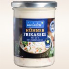 Ein Frikassee zum Verlieben: Das Bio-Hühnerfleisch wird schonend in einem Geflügelfond geschmort, ehe es in Handarbeit gewürfelt wird. Der Fond wird anschließend mit Sahne, einem Schuss Zitronensaft sowie verschiedenen Gewürzen verfeinert. Durch das besonders schonende Kochen behalten alle Zutaten ihre typische Konsistenz und ihre wertvollen Inhaltsstoffe.